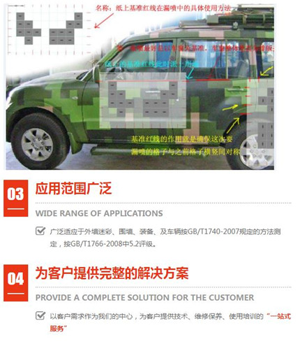迷彩偽裝涂料漆、環保建材等領域,但外墻迷彩漆是一種特殊的涂料,主要用于提供防護和迷彩效果,具有耐候性強新產流程全程監控